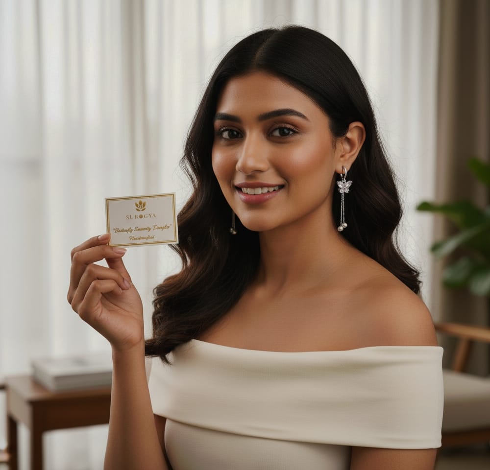 Embrace ethereal elegance with the Handcrafted "Butterfly Serenity Dangles" earrings from Surogya. These exquisite dangle earrings capture the grace and symbolism of the butterfly, representing transformation and joy.