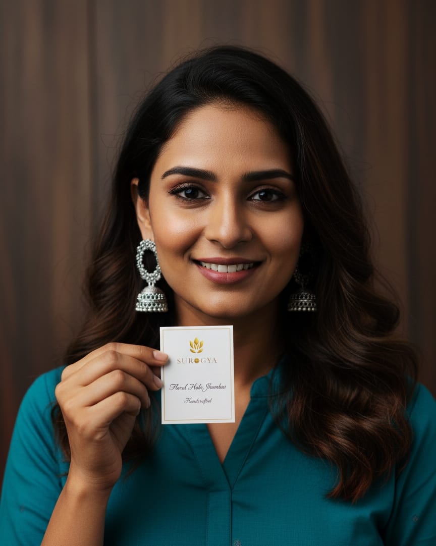 Elevate your ethnic jewellery collection with these stunning Handcrafted Oxidised Silver Floral Halo Jhumkas by SURGYA. These traditional Indian earrings feature a delicate, circular floral halo at the top, leading down to a classic bell-shaped jhumka. The dome is beautifully detailed and finished with small, dangling beads at the base, adding movement and charm. Perfect for pairing with sarees, lehengas, or kurtis, these jhumkas offer a blend of traditional elegance and contemporary style. Each pair is handcrafted, ensuring a unique and high-quality finish.