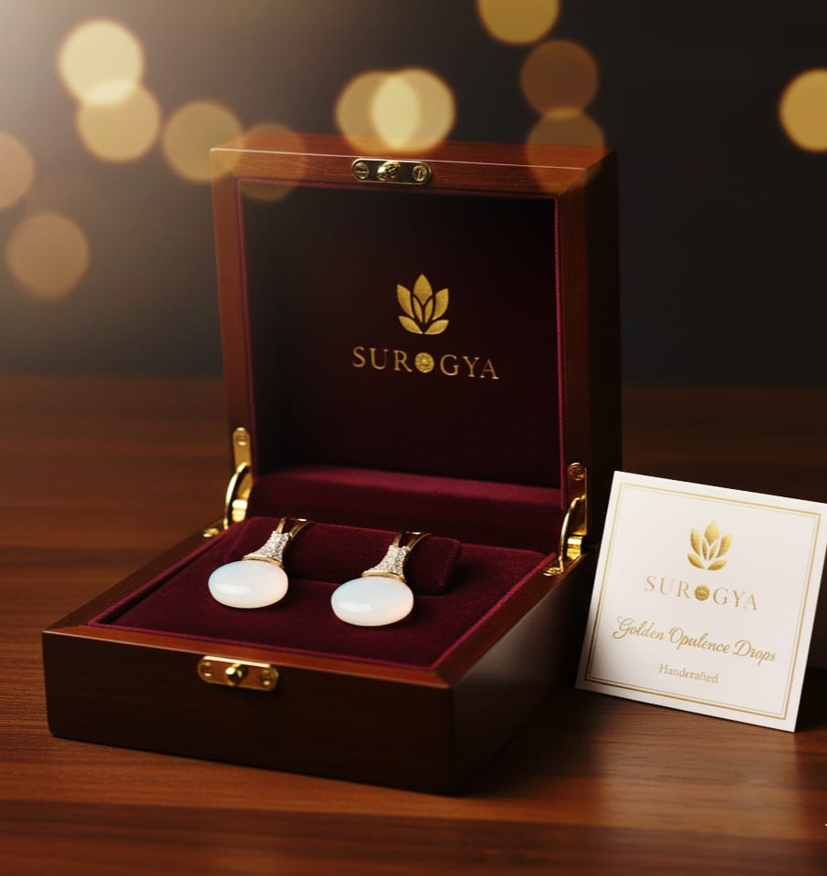 These exquisite Surogya Golden Opulence Drops combine the ethereal glow of smooth opalite stones with the sparkle of brilliant white zircons, set in a golden-toned, handcrafted design. Perfect for adding a touch of sophisticated glamour to any look.