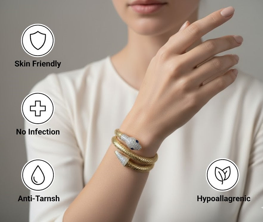 Iconic Design: A flexible, multi-coil design that mimics the seductive movement of a snake, styled to be a comfortable yet bold cuff bangle.